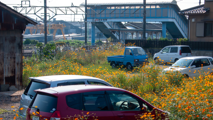 コスモスに埋もれた加佐登駅駐車場。秋はもうそこまで来ています。