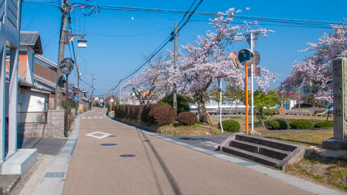 神社の桜の下で休憩します。この辺りから休めそうな場所があれ休憩を入れます。