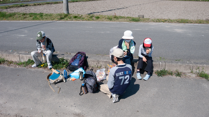 今朝コンビニで買った2回目の朝食を道端で食べます。もうどこでもいつでも抵抗なく休憩で