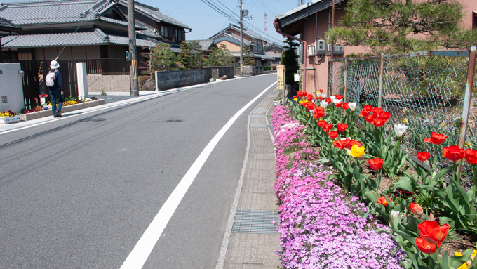 民家が立ち並ぶ変化のない街道沿いに突然現れる鮮やかな花にハッとさせられます。