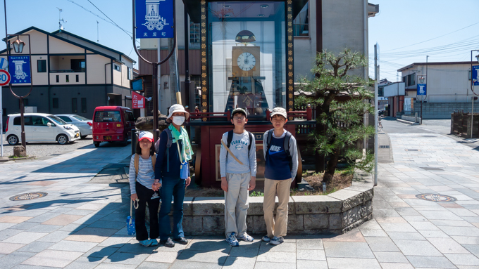 水口宿の出口(東の入り口)のカラクリ時計の前で記念撮影をします。